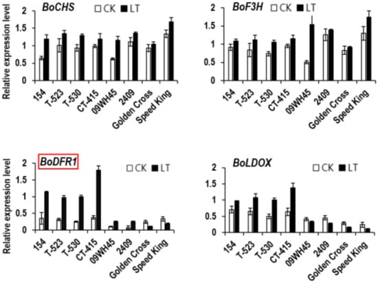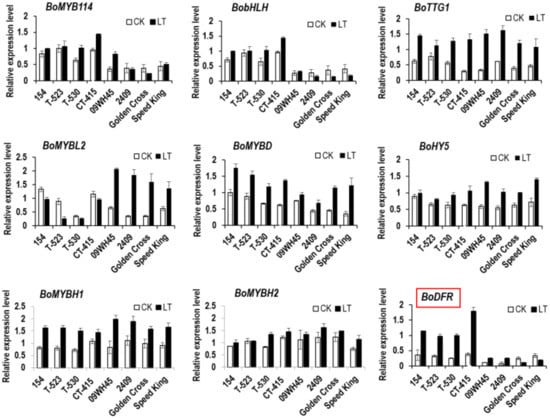 Expression analysis of anthocyanin biosynthesis genes encoding regulatory proteins in cabbage genotypes. Plants were grown either under normal growth temperature (CK; 20–30 °C) or under LT (see Figure 3). Gene expression was analyzed by qRT-PCR. Expression level of BoActin2 was set to one and used for data normalization. Data represent mean ± SD (n = 3). BoDFR1 data were same as that in Figure 4B and used as a reference.