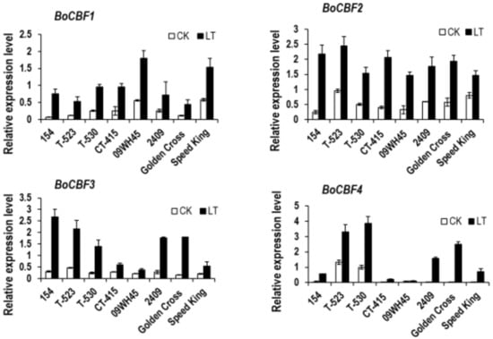 Expression analysis of four CBF genes by qRT-PCR. Cabbage plants were grown either under normal growth temperature (CK; 20–30 °C) or under LT condition (see Figure 3). Expression level of BoActin2 was set to one and used for data normalization. Data represent mean ± SD (n = 3).