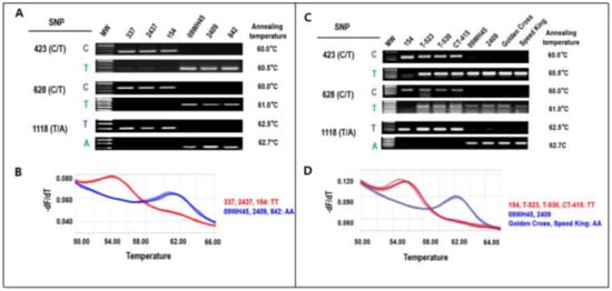We designed PCR primers to distinguish between BoDFR1 and BoDFR1v based on cytosine (C)/adenine (A), cytosine (C)/thymine (T), and thymine (T)/adenine (A) SNPs at nucleotide positions 423, 628, and 1118, respectively (Figure 5, Table 2). First, PCR was performed using these primers and genomic DNA extracted from six inbred lines provided by Asian Seed Co. (Figure 10A) and eight inbred lines and cultivars selected in Figure 3 for further analysis (Figure 10A,C, Table 2). All primer pairs could discriminate the six inbred lines based on the three SNPs (Figure 10A), but only the primer pair specific to the T/A SNP at position 1118 correctly discriminated among the eight inbred lines and cultivars (Figure 10C). Cabbage cultivars T-523, T-530, and CT-415 were heterozygous for SNPs at nucleotide positions 423 and 628 (Figure S1, Figure 5). Then, based on these PCR results, we designed HRM primers targeting the T/A SNP at nucleotide position 1,118. The results showed that this SNP distinguished between BoDFR1 and BoDFR1v (Figure 10B,D). Therefore, we conclude that the T/A SNP could be used to discriminate between HAAs and LAAs under LT conditions.
