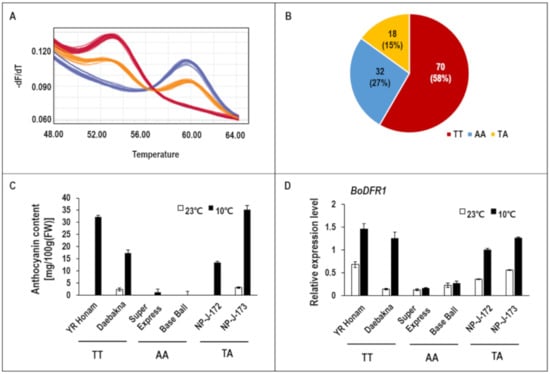 To validate this marker, we used the HRM primer set to genotype 120 cabbage inbred lines and cultivars (Figure 11A,B). Among these 120 samples, 70 (58%) were homozygous for the TT allele (HAA homozygote), 32 (27%) were homozygous for the AA allele (LAA homozygote), and 18 (15%) were heterozygous (TA allele). Interestingly, all Chinese cultivars tested in this study carried the AA type (BoDFR1v) (Table S1). Some of the heterozygotes were confirmed by sequencing (Figure S2), and association of the T/A SNP with anthocyanin accumulation was confirmed by examining the level of anthocyanins and BoDFR1 expression (Figure 11C,D). The phenotype of heterozygotes (T/A allele) resembled that of HAA homozygotes (TT allele), indicating dominance of the T allele (HAA genotype was TT or TA). These results indicate that the HRM primer pair developed in this study is useful for distinguishing between BoDFR1 and BoDFR1v genotypes. Notably, HAAs were more abundant than LAAs or heterozygotes, and BoDFR1 was dominant to the BoDFR1v allele.