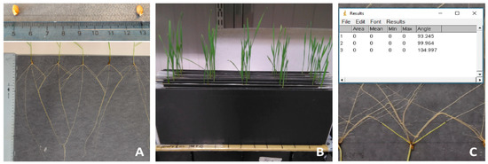 Experimental setup for the analysis of seminal root traits. Seeds were placed 8 cm apart on moist filter paper (A) and kept in a box with distilled water in a growth chamber for 14 days at 22 °C under a 16-h light photoperiod (B). (C) Example of seminal root angle measurement, using ImageJ software.