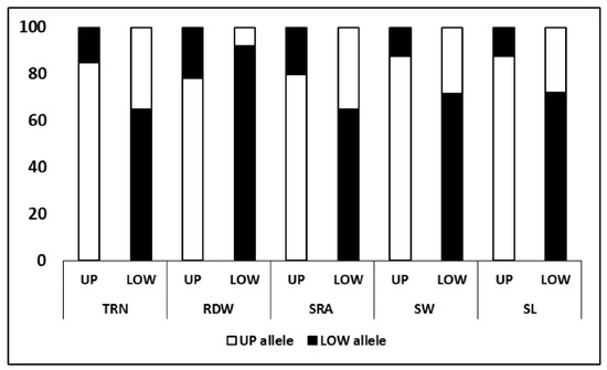 Marker allele frequency means from landraces within the upper and lower 10th percentile for the analyzed traits. All significant markers shown in Table 5 are included. TRN, total root number; RDW, root dry weight; SRA, seminal root angle; SW, seed weight; SL, seed length.
