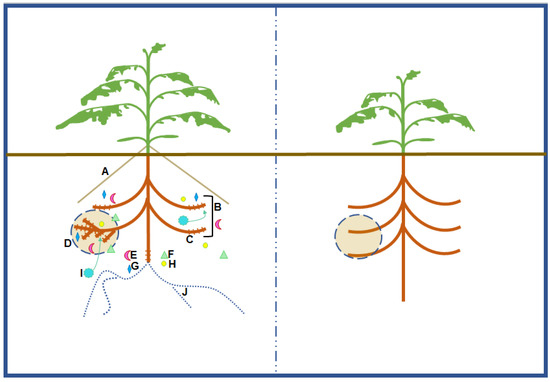 A tomato plant efficient in phosphorus (P) acquisition. A hypothetical tomato adapted for P-acquisition efficiency (PAE) (left) can be compared to a hypothetical tomato inefficient in P acquisition (right). Root morphological strategies a tomato could employ to cope with a P deficit include adventitious rooting (A), topsoil foraging (B), or root hair growth (C) to better exploit a given volume of soil. Root proliferation in nutrient dense patches (D) exemplifies plasticity of an efficient root system to optimize a heterogeneous supply of soil P. Roots may exude enzymes such as phosphatase (E) to mineralize organic P sources. Roots may also exude organic acids such as citrate, malate, fumarate, or oxalate (F) to chelate bound-P. Reductants such as glucose (G) may reduce ferric iron to mobilize P. Exudation of hydrogen ions (H) acidify the rhizosphere to solubilize calcium phosphates. Rhizosphere acidification can also be achieved through excess cation uptake (I). Symbiosis with mycorrhizal fungi (J) allows for uptake of P transferred from sources unavailable to the root. There are no mechanisms illustrated for the P-inefficient representative. However, any listed strategy could be present in the root system of a P-inefficient tomato, but likely expressed to a lesser degree than a P-efficient representative.