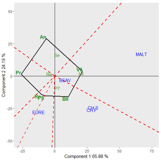 Which won where configuration of GGE Biplot figure of stand frequency (%) evaluated on cool-season grass cultivars at rangeland environments in the Intermountain and High Plains regions of the USA. Environments are indicated in blue as follows: BEAV—Beaver, UT, CH.S—Cheyenne, WY-Spring, CH.F—Cheyenne, WY-Fall, EURE—Eureka, UT, and MALT—Malta, ID. Cultivars are indicated in green as follows: An—Anatone bluebunch wheatgrass, BoII—Bozoisky II Russian wildrye, FS—FirstStrike slender wheatgrass, HyII—Hycrest II crested wheatgrass, P7—P-7 bluebunch wheatgrass, Pr—Pryor slender wheatgrass, Re—Recovery western wheatgrass, Ro—Rosana western wheatgrass, Se—Secar Snake River wheatgrass, VaII—Vavilov II Siberian wheatgrass.