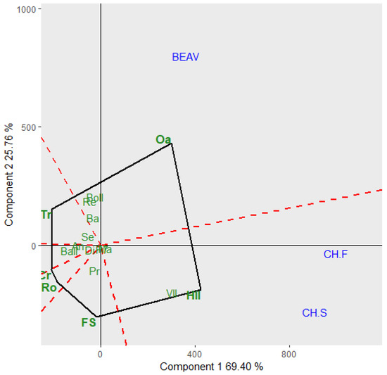 Which won where configuration of GGE Biplot figure of dry matter yield (kg·ha-1) evaluated on cool-season grass cultivars at rangeland environments in the Intermountain and High Plains regions of the USA. Environments are indicated in blue as follows: BEAV—Beaver, UT, CH.S—Cheyenne, WY-Spring, and CH.F—Cheyenne, WY-Fall. Cultivars are indicated in green as follows: An—Anatone bluebunch wheatgrass, Ba—Bannock thickspike wheatgrass, BaII—Bannock II thickspike wheatgrass, BoII—Bozoisky II Russian wildrye, Cr—Critana thickspike wheatgrass, Di—Discovery Snake River wheatgrass, FS—FirstStrike slender wheatgrass, HII—Hycrest II crested wheatgrass, Ma—Manchar smooth bromegrass, Oa—Oahe intermediate wheatgrass, P7—P-7 bluebunch wheatgrass, Pr—Pryor slender wheatgrass, Re—Recovery western wheatgrass, Ro—Rosana western wheatgrass, Se—Secar Snake River wheatgrass, Tr—Trailhead basin wildrye, VII—Vavilov II Siberian wheatgrass.