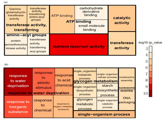 Gene ontology (GO) analysis of differentially expressed genes (DEGs) via AgriGO [17] and REVIGO [14]. The size and color of each square/rectangle indicate the level of enrichment (−log10 p-value). (a) Molecular function of downregulated genes in sh2. (b) Biological processes of the upregulated genes in sh2.