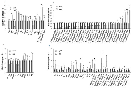 We identified seven AGPase-encoding DEGs between mutant and wild-type kernels. Out of these DEGs, five were upregulated and two were downregulated genes along with Sh2 in mutant lines. We identified nine additional DEGs involved in starch biosynthesis, including one phosphoglucomutase (PGM) gene, three glycogen synthase genes, three glucan-branching enzyme (GBE) genes, and one starch debranching enzyme gene. Out of these, only the starch debranching enzyme gene was downregulated in sh2 mutant lines (Figure 2a). In addition, 27 zein genes were downregulated and five were upregulated, which may lead to the reduced zein levels in the mutant kernels (Figure 2b). Many genes influencing zein accumulation and maize kernel development were differentially expressed between mutant and wild-type kernels, such as the classic semi-dominant maize endosperm mutant genes fl1, fl2, fl3 and fl4 [18,19,20,21]; the classic recessive maize endosperm mutant genes o1 and o7 [21,22]; and the maize endosperm mutant genes pbf1, bZIP17, and bZIP22 [23,24] and PPDK1 (Figure 2c), all of which could affect storage protein gene expression [25].