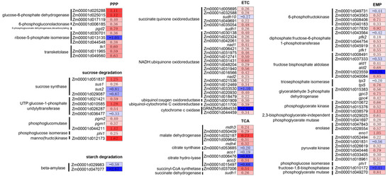 As the weight of mature sh2 kernels was substantially reduced, we focused on genes in the carbohydrate catabolism pathway. We identified 103 DEGs in various carbohydrate catabolism pathways. For every enzyme in the Embden–Meyerhof–Parnas (EMP) pathway, at least one gene was differentially expressed, and most of these DEGs were upregulated in sh2 (Figure 3). Some of these enzymes are related to energy supply and maize kernel development, such as phosphofructokinase [26], and there is a competitive relationship between the EMP pathway and starch biosynthesis [27].