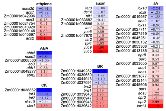 DEGs related to phytohormone-related. Pathways include: ethylene, auxin, Abscisic Acid (ABA), cytokinin (CK), Brassinosteroids (BR) and the Jasmonic Acid (JA). The data and the colors of the rectangles indicate mean log2 (fold change) of the DEGs; plant metabolic pathway databases were used for pathway analysis [40].