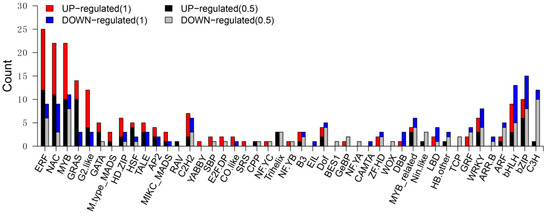 Distribution of differentially expressed TF genes between wild-type and mutant kernels. The graph shows the number of upregulated genes (log2 (fold change) > 1 or log2 (fold change) < −1) in each family identified in the mutant (red) and wild-type (blue) and the number of upregulated genes (log2 (fold change) > 0.5 or log2 (fold change) < −0.5) in each family identified in the mutant (black) and wild-type (gray).