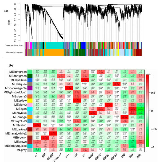 WGCNA using RNA-seq data for 12 endosperm mutants. (a) Hierarchical cluster analysis showing the co-expression modules identified by WGCNA; (b) Module–trait associations. Each row corresponds to a module. Each column shows one mutant (dek represents the four dek mutants used in this study, similarly zein stands for the seven zein mutants. The values in each cell represent the corresponding correlation coefficient and p-value.