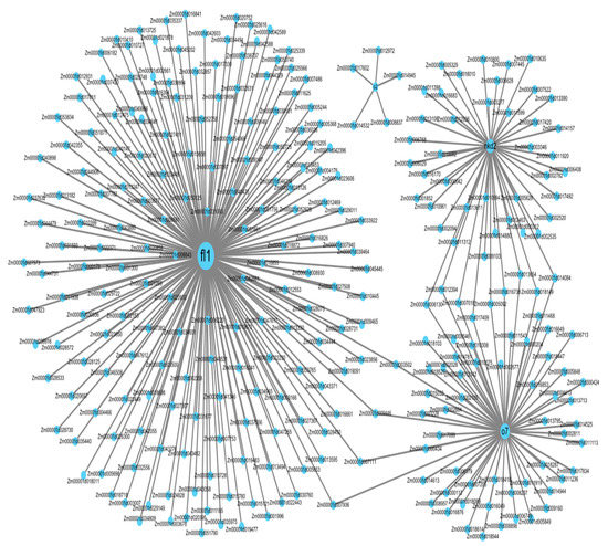 To further understand the transcriptional mechanism regulating starch biosynthesis in early endosperm development (15 DAP) in maize, we selected four maize endosperm mutants belonging to the “orange” module (Figure 6). RNA-seq data from these mutants (fl1, o7, nkd2 and o2) were downloaded from the SRA database. The imprinted floury1 mutant gene fl1 presented greater co-expression with genes related to transcriptional activity (Figure 7). It is followed by nkd2 and o7, while o2 is only associated to five genes.