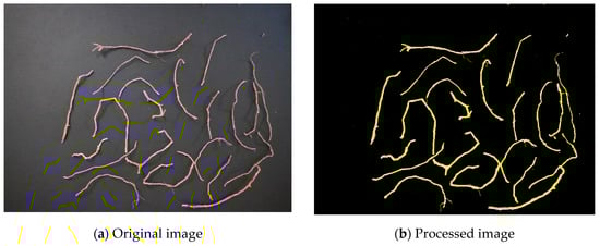 Figure 1 shows the original and processed pictures for one of the root images. The output folder contains the processed images and a summary excel file that illustrates the name of each image and the values (%) of the classification for each category. The total surface area of yellow roots from the image classification was calculated by summing the total area occupied by pixels classified as the root surface area. These values were multiplied by π “3.14”, assuming the roots have cylindrical shapes.