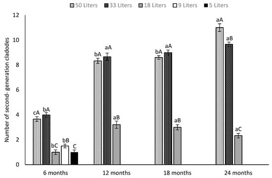 Absolute number of second-generation cladodes in potted plants of Opuntia ficus-indica at four sampling dates (6, 12, 18 and 24 months) and at different soil volumes (50, 33, 18, 9 and 5 L). Different lowercase letters indicate significant differences (Tukey’s test at p ≤ 0.05) in the second-generation cladodes number within the sampling dates for the same pot size. Different capital letters indicate differences (Tukey’s test at p ≤ 0.05) in the second-generation cladodes number according to pot size on the same sampling date. Vertical bars represent the standard error (n = 5 plants).