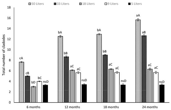 Effect of five different soil volumes (50, 33, 18, 9 and 5 L) and four different sampling dates (6, 12, 18 and 24 months) on the total number of cladodes per Opuntia ficus-indica plant. Different lowercase letters indicate significant differences (Tukey’s test at p ≤ 0.05) in the total cladodes number between sampling dates for the same pot size. Different capital letters indicate significant differences (Tukey’s test at p ≤ 0.05) in the total cladodes number between different pot sizes at the same sampling date. Vertical bars represent the standard error. The data are presented as means ± SE (n = 5 plants).
