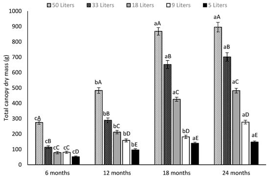 Effect of five different soil volumes (50, 33, 18, 9 and 5 L) and four different sampling dates (6, 12, 18 and 24 months) on the dry mass of the canopy (g) of Opuntia ficus-indica. Different lowercase letters indicate significant differences (Tukey’s test at p ≤ 0.05) in the total canopy dry mass between sampling dates for the same pot size. Different capital letters indicate significant differences (Tukey’s test at p ≤ 0.05) in the total canopy dry mass between different pot sizes at the same sampling date. Vertical bars represent the standard error (n = 5 plants).