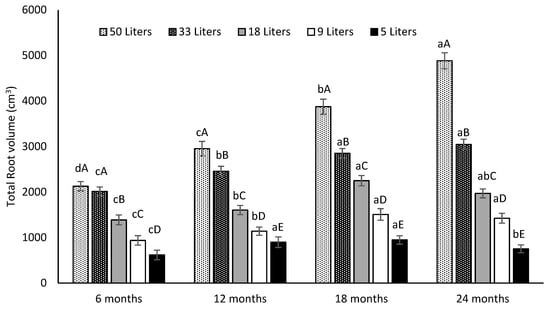 Effect of five different soil volumes (50, 33, 18, 9 and 5 L) and four different sampling dates (6, 12, 18 and 24 months) on the total root volume (cm3) per Opuntia ficus-indica plant. Different lowercase letters indicate significant differences (Tukey’s test at p ≤ 0.05) in the total root volume (cm3) between sampling dates for the same pot size. Different capital letters indicate significant differences (Tukey’s test at p ≤ 0.05) in the total root volume (cm3) between different pot sizes at the same sampling date. Vertical bars represent the standard error. Data are presented as means ± SE (n = 5 plants).