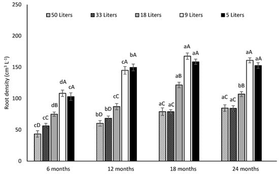 Effect of five different soil volumes (50, 33, 18, 9 and 5 L) and four different sampling dates (6, 12, 18 and 24 months) on the total root density (cm3 L−1) of Opuntia ficus-indica. Different lowercase letters indicate significant differences (Tukey’s test at p ≤ 0.05) in the total root density (cm3 L−1) between different sampling dates for the same pot size. Different capital letters indicate significant differences (Tukey’s test at p ≤ 0.05) in the total root density (cm3 L−1) between different pot sizes at the same sampling date. Vertical bars represent the standard error. Data are presented as means ± SE (n = 5 plants).