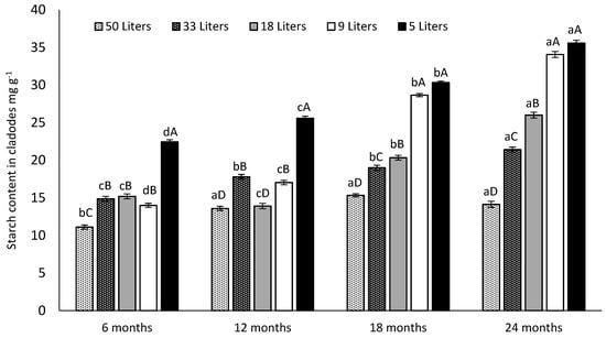 Effect of five different soil volumes (50, 33, 18, 9 and 5 L) and four different sampling dates (6, 12, 18 and 24 months) on the cladodes starch content of Opuntia ficus-indica. Different lowercase letters indicate significant differences (Tukey’s test at p ≤ 0.05) between different sampling dates for the same pot size. Different capital letters indicate significant differences (Tukey’s test at p ≤ 0.05) between different pot sizes at the same sampling date. Vertical bars represent the standard error. Data are presented as means ± SE (n = 5 plants).