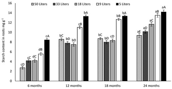 Effect of five different soil volumes (50, 33, 18, 9 and 5 L) and four different sampling dates (6, 12, 18 and 24 months) on the roots starch content of Opuntia ficus-indica. Different lowercase letters indicate significant differences (Tukey’s test at p ≤ 0.05) in the total root density (cm3 L−1) between different sampling dates for the same pot size. Different capital letters indicate significant differences (Tukey’s test at p ≤ 0.05) in the total root density (cm3 L−1) between different pot sizes at the same sampling date. Vertical bars represent the standard error. Data are presented as means ± SE (n = 5 plants).