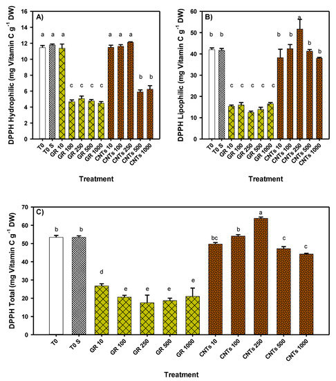 The antioxidant capacity determined in the leaves of tomato seedlings treated with carbon nanomaterials. Each data point is the average of five replicates ± standard error. Different letters indicate significant differences between treatments according to Fisher’s least significant difference test (p ≤ 0.05). T0: absolute control. T0 S: sonicated control. GR: graphene. CNTs: carbon nanotubes. DPPH: 2,2-difenil−1-picrilhidracilo (equivalents of vitamin C mg g−1 DW). H: hydrophilic compounds. L: lipophilic compounds. DPPH Total: total antioxidant capacity.
