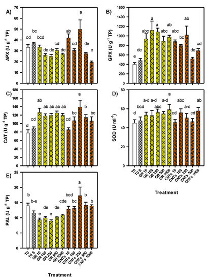 The CNTs also had a positive effect, with the CNTs 250 treatment being the one with the highest increase at 55% more than the absolute control (Figure 6B). The activity of the catalase enzyme was increased in all graphene doses, and, with the exception of the lowest dose of CNTs (10 mg L−1), the rest of the treatments also increased the activity of the enzyme. The treatment of CNTs 250 generated the greatest increase in catalase activity at 79% more than the absolute control (Figure 6C). The activity of SOD increased to a greater extent with high doses of both CNMs, where the GR 1000 treatment showed 32% more activity than the absolute control. The treatment of CNTs 1000 was 29% more (Figure 6D). The results indicated that the CNTs 250 treatment had the greatest influence on the enzymatic activity, as it was the best for PAL, APX, and catalase (CAT), and it was statistically equal to the best treatment in GPX and SOD (Figure 6).
