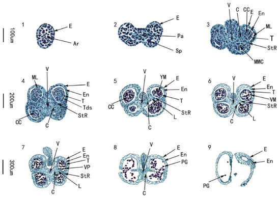 Transverse sections of fixed celery anthers stained with safranin O-fast green reagent at developmental stages 1–9. Pa, Parietal Tissue; Sp, Sporogenous Tissue; E, Epidermis; En, Endothecium; CC, Central Callose; ML, Middle Layer; T, Tapetum; L, Lacunae; StR, Stomium Region; MMC, Microspore Mother Cells; Tds, Tetrads; YM, Young Microspores; VM, Vacuolate Microspores; VP, Vacuolate Pollen; PG, Pollen Grains; V, Vascular Region; C, Connective Tissue. Scale bar is 100 µm for stages 1–3, 200 µm for stages 4–6 and 300 µm stages 7–9.