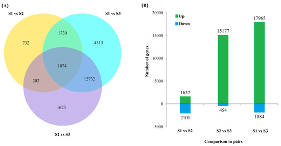 Using DESeq2 software, 39,218 DEGs were identified in at least one comparison (S1 vs. S2, S1 vs. S3, S2 vs. S3) (Figure 2A and Table S3). The number of DEGs in S1 vs. S3 was the largest, with a total of 19,849, followed by S2 vs. S3, then S1 vs. S2, with the number of genes being 15,631 and 3738, respectively. There were also 1074 genes that were differentially expressed in the three combinations. All these results suggested that the transcriptome in celery flowers was increasingly different as development progressed. Comparing each combination of the DEGs (including upregulation and downregulation) showed (Figure 2B) that the number of upregulated DEGs was 1,637 and downregulated DEGs were 2,101 at S1 vs. S2. However, the upregulated numbers of S1 vs. S3 and S2 vs. S3 genes were 17,965 and 15,177, respectively, and downregulated numbers were 1,884 and 454 respectively. This further suggested that differential genes expression was apparent during flower development and, in particular, that an initial reorganization of gene expression was followed by the upregulation of a great number of transcripts in later stages.