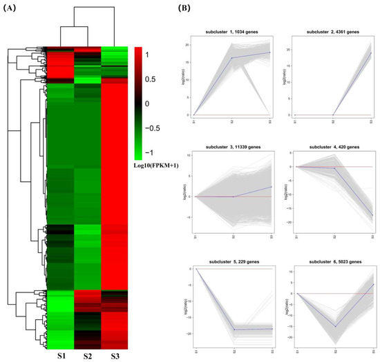The trend seen in Figure 2B was confirmed when the expression levels of the DEGs were clustered (Figure 3A). Specifically, the expression level of most DEGs was higher in S3 stage than in the S1 and S2 stages. As shown in Figure 3B, the expression level of 1,034 genes steadily increased between the three stages (subcluster 1). These genes were upregulated from S1 to S3 and the increase from S1 to S2 was larger than that from S2 to S3. A total of 4,361 genes were upregulated between S2 and S3 stages (subcluster 2), while the expression levels of 11,339 genes had a slight upward trend (subcluster 3). Moreover, 420 genes showed a slight downward trend from S1 to S2, but were significantly downregulated at S3 (subcluster 4). A total of 229 genes were significantly downregulated from S1 to S2, but not significantly at S3 (subcluster 5). In addition, 5,023 genes were significantly downregulated during S1 to S2 while upregulated during S3 (subcluster 6). These results further indicate the complexity of gene regulation during celery flower development.