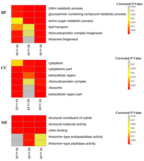 GO (genomic theory database) enrichment analysis of DEGs. BP, Biological Process; CC, Cellular Component; MF, Molecular Function. Corrected p-Value < 0.05 represents enrichment, the smaller the p-Value, the closer the color is to red and the more significant the enrichment.