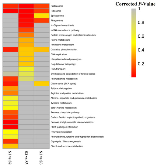 Figure 5 reveals that KEGG annotations for the three pairs (S1 vs. S2, S1 vs. S3, and S2 vs. S3) were significantly enriched in proteasome and ribosome pathways. DEGs that were significantly enriched in S1 vs. S2 were involved in oxidative phosphorylation, carbon fixation in photosynthetic organisms, pentose and glucuronate interconversions, plant–pathogen interaction, pentose phosphate pathway, glycolysis/gluconeogenesis, and other metabolic processes. We speculate that these processes regulated nutrients levels during anther development. There was no obvious enrichment in these processes in S1 vs. S3 and S2 vs. S3. In contrast, DEGs that were not enriched in S1 vs. S3 and S2 vs. S3 were associated with processes that regulate nutrients levels and were enriched in the phagosome and spliceosome processes. DEGs found to be only enriched in S2 vs. S3 were linked to the N-glycan biosynthesis, mRNA monitoring pathway, protein processing in endoplasmic reticulum, purine metabolism, pyrimidine metabolism, DNA replication, and other processes.