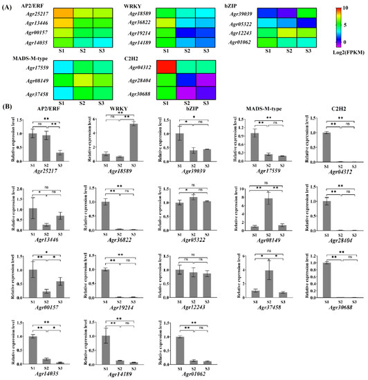 Gene expression was validated using qPCR for the members of five transcription factor families associated with flower development: AP2/ERF (Agr25217, Agr13446, Agr00157, Agr14035); WRKY (Agr18589, Agr36822, Agr19214, Agr14189); bZIP (Agr39039, Agr05322, Agr12243, Agr01062); MASD-M-type (Agr17559, Agr08149, Agr37458); and C2H2 (Agr04312, Agr28404, Agr30688). Figure 7 shows that results of qPCR analysis and transcriptome sequencing were consistent in terms of expression trends during flower development.