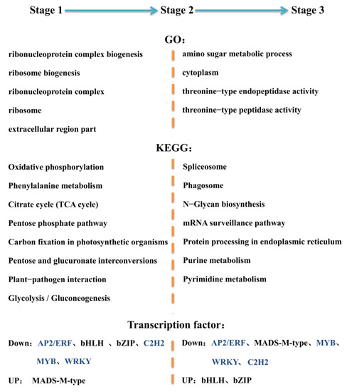 An overview of function and transcription factor family changes involved in celery anther development at the three flower developmental stages (S1, S2, S3). GO and KEGG both show different functions at different stages. The transcriptional abundance of transcription factor families with a consistent trend is shown in blue.