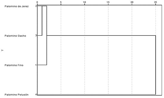 According to the 58 descriptors studied, the HCA analysis (Figure 1) shows how Palomino Pelusón is the most different somatic variant regarding its morphological traits. Furthermore, the rest of the variants analysed are displayed in one group, Palomino Fino being the most different type among this second group.