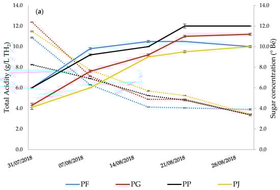 As far as the evolution of total acidity is concerned, the differences described (Figure 2a) are considered normal, since during ripening, different physical-chemical processes take place that lead to a reduction in the acid fraction of the berries and, therefore, to a decrease in total acidity and an increase in pH []. The great decrease in the acid fraction of the must may be due to the high temperatures observed in the first phase of ripening (Figure S1a–c), which produces an increase in the respiratory combustion phenomena of malic acid [,]. Theoretically, the best weather conditions for optimum ripening of sherry grapes include sunny but not excessively hot weather []. If temperatures exceed 38 °C for 4–6 consecutive days, fruit ripening stops and the musts obtained under these conditions have high pH values and low sugar and acid content [].