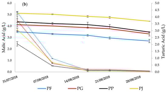 (a,b) Evolution of total acidity (left axis, dotted line) and sugar concentration (right axis, solid line) (a) and malic (left axis, dotted line) and tartaric acid (right axis, solid line) (b) during ripening final stages of Palomino Fino (PF), Palomino Gacho (PG), Palomino Pelusón (PP) and Palomino de Jerez (PJ).
