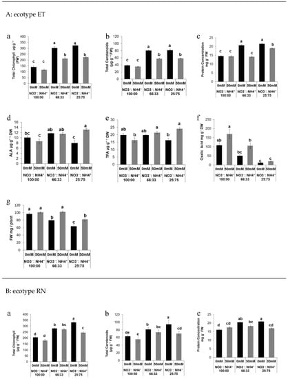 Plants exposed to high levels of ammonium and in saline conditions showed a decrease in protein content, but the levels found there were higher compared to the plants exposed to 100% NO3− nutrition (Figure 1Ac). Significant differences (P < 0.05 in the levels of the α-Linolenic acid (ALA) (Figure 1Ad,Bd) and total fatty acid (TFA) (Figure 1Ae,Be) were found in both ecotypes. The highest levels of ammonium in ecotype ET grown under saline conditions induced the up-regulation of TFA and ALA (Figure 1Ad,Ae). Lower levels of these compounds were found in plants exposed to high levels on ammonium without salinity and in plants exposed to 100% NO3− with salinity (Figure 1Ad,Ae). In ecotype RN, the levels of TFA and ALA were affected by salinity in plants treated either with 100% or 66% NO3− (Figure 1Bd,Be).