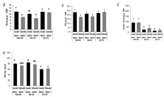 In contrast to ecotype ET, the TFA and ALA levels in RN were not affected by high levels of ammonium (Figure 1Bd). OA was highly significantly (P < 0.001) affected by nitrate to ammonium ratios, and there was also a significant effect (P < 0.01) of salinity on OA content (Figure 1Af,Bf). The combination of the salinity and nitrogen forms was not significant (P > 0.05) in terms of OA accumulation (Figure 1Af). The lowest level of OA was observed in plants exposed to 75% of ammonium while the highest levels were found in plants exposed to 100% NO3− in both ecotypes (Figure 1Af,Bf). Salinity decreased levels of OA in plants grown either with 33% or 75% ammonium compared with plants grown with 100% NO3− in both ecotypes (Figure 1Af,Bf). Shoot FW was significantly (P < 0.001) affected by nitrogen form and salinity. Moreover, a significant (P < 0.01) effect of the interaction of salinity and nitrogen form was observed in both ecotypes (Figure 1Ag,Bg). The highest shoot FW accumulation was found in plants exposed to 100% NO3− under saline and non-saline conditions (Figure 1Ag,Bg). Ammonium affects shoot FW, where the combination of ammonium with salinity enhanced shoot FW in ecotype ET (Figure 1Ag); this effect was not observed in ecotype RN (Figure 1Bg).