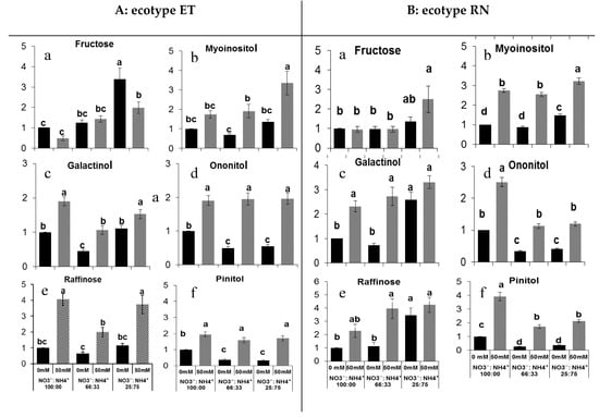 To cope with adverse environmental conditions, plants accumulate osmoprotectants to alleviate cellular hyperosmolarity and ion disequilibrium [33]. Sugars and polyols such as ononitol and pinitol act as compatible solutes resulting in increased cellular osmolarity and as scavengers of reactive oxygen species (ROS) [34,35,36]; these sugars have been associated with drought and salinity tolerance. Ononitol, pinitol, raffinose, and myoinositol, slightly accumulated under saline conditions in both ecotypes. Nevertheless, the accumulation of ononitol and pinitol under saline conditions in ecotype ET were significantly higher at all three nitrate-to-ammonium ratios (100%:0%; 66%:33%; 25%:75%), contrasting with ecotype RN where these sugars were higher only in the plants exposed to elevated NO3−. The current study suggests that the main strategies for tolerating salinity are by the up-accumulation of sugars and polyols. These findings are consistent with the results obtained by [33], where the combined effect of drought and heat leads to increased sugar synthesis.