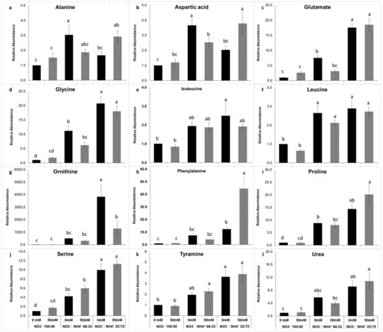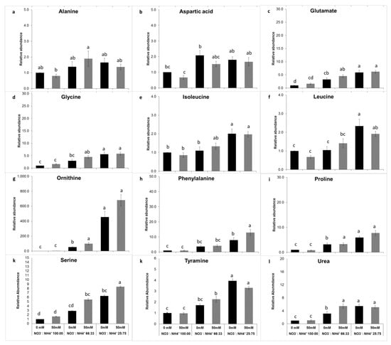 Effect of the nitrate to ammonium ratio (100:00, 66:33, 25:75) and salinity (0, 50 mM) on the amino acid accumulation of P. oleracea leaves ecotype RN. The values are means ± SE (n = 6). Bars with different letters are significantly different between treatments, P ≤ 0.05, as determined by Tukey–Kramer HSD.