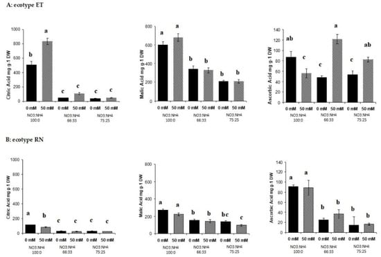Effect of the nitrate to ammonium ratio (100:00, 66:33, 25:75) and salinity (0, 50 mM) on the organic acid accumulation of P. oleracea leaves ecotypes ET (A) and RN (B). The values are means ± SE (n = 6). Bars with different letters are significantly different between treatments, P ≤ 0.05, as determined by Tukey–Kramer HSD.