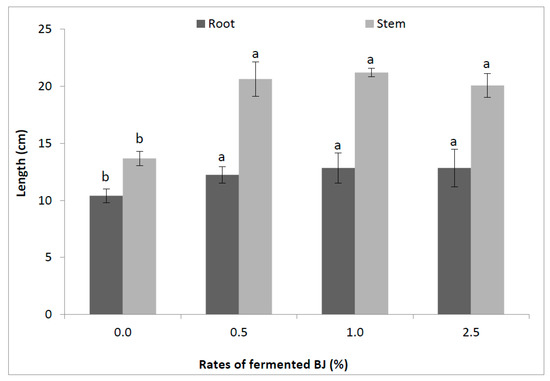 Root and stem length of sweet basil plants treated with different rates of fermented BJ. Sample size n = 6 (mean ± SD). Different letters above the same columns show significant differences at the level of p ≤ 0.05.