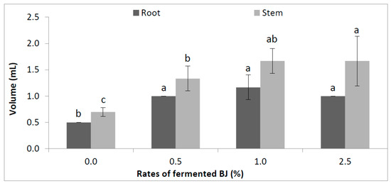 Stem and root volume of sweet basil plants treated with different rates of fermented BJ. Sample size n = 6 (mean ± SD). Different letters above the same columns show significant differences at the level of p ≤ 0.05.