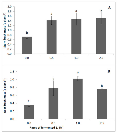 Fresh mass of stem (A) and root (B) of sweet basil plants treated with different rates of fermented BJ. Sample size n = 6 (mean ± SD). Different letters above the same columns show significant differences at the level of p ≤ 0.05.