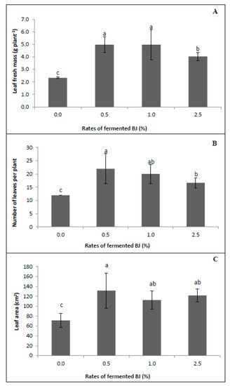(A) Leaves fresh mass; (B) number of leaves; (C) leaf area of sweet basil plants treated with different rates of fermented BJ. Sample size n = 6 (mean ± SD). Different letters above the same columns show significant differences at the level of p ≤ 0.05.