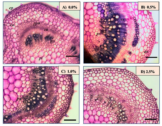 The cortex is made up of angular collenchyma (two to four cells thick) and typical parenchymatous cells. The pith consists of mainly parenchymatous cells, but the ratio of primary and secondary vascular tissues is dependent on the treatments. Treatments 0.5% and 1.0% resulted in well-developed secondary vascular tissues (Figure 5).