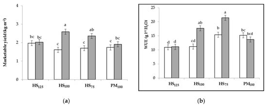 While the irrigation strategy did not affect the marketable yield of plants grown on mulched soil, a significant difference was shown only between the treatments HS50 and PM25, which had a lower marketable yield among the mulched treatments. The lowest marketable yield values were found among plants grown on bare soil and associated with HS25 (Figure 3a).