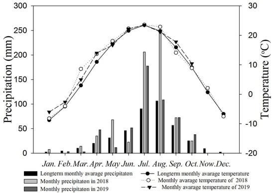 The experimental site was in a field station in the Shaanxi Institute of Sand Control (38°19′49″ N, 109°42′42″ E, 1201 m a.s.l. Mu Us Sand Land) with a typical warm temperate monsoon climate, Shaanxi Province, China. The annual average temperature is 8.3 °C and the mean annual precipitation is 365.7 mm. Precipitations are concentrated in July and August. In our experimental period (2018), the maximum precipitation was observed in August. However, the precipitation was 206 mm in July, followed by 246 mm in August, which was 150% higher than usual. The cumulative precipitation during the growing season (from early May to the end of September) was 615.3 mm in 2018 and 421.9 mm in 2019 (Figure 1).