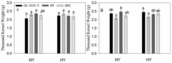 Effects of biochar and soft rock treatments on the thousand kernel weight of millet grown in two fertilizer levels conducted in 2018 (A) and 2019 (B). CK, sand only; C, sand and biochar; SR, sand and soft rock; SRC, sand, biochar, and soft rock; NY, normal yield pattern; HY, high yield pattern. Data were shown in mean ± SE. Different letters indicate significant differences (p < 0.05).