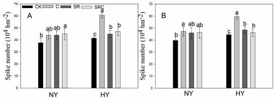 Effect of biochar and soft rock treatments on the spike number in two fertilizer levels conducted in 2018 (A) and 2019 (B). CK, sand only; C, sand and biochar; SR, sand and soft rock; SRC, sand, biochar, and soft rock; NY, normal yield pattern; HY, high yield pattern. Data were shown in mean ± SE. Different letters indicate significant differences (p < 0.05).